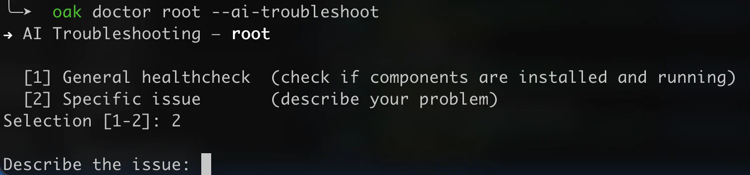 Oak doctor with the -ai-troubleshoot flag uses Claude CLI. It requires either an active subscription or a payment method configured for your token consumptions. Check the pricing here.